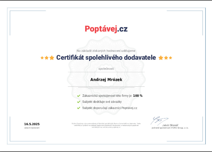 “Jsme velmi spokojeni s odvedenou prací. Firmu doporučujeme. Byli rychlí a svou práci odvedli precizně.”